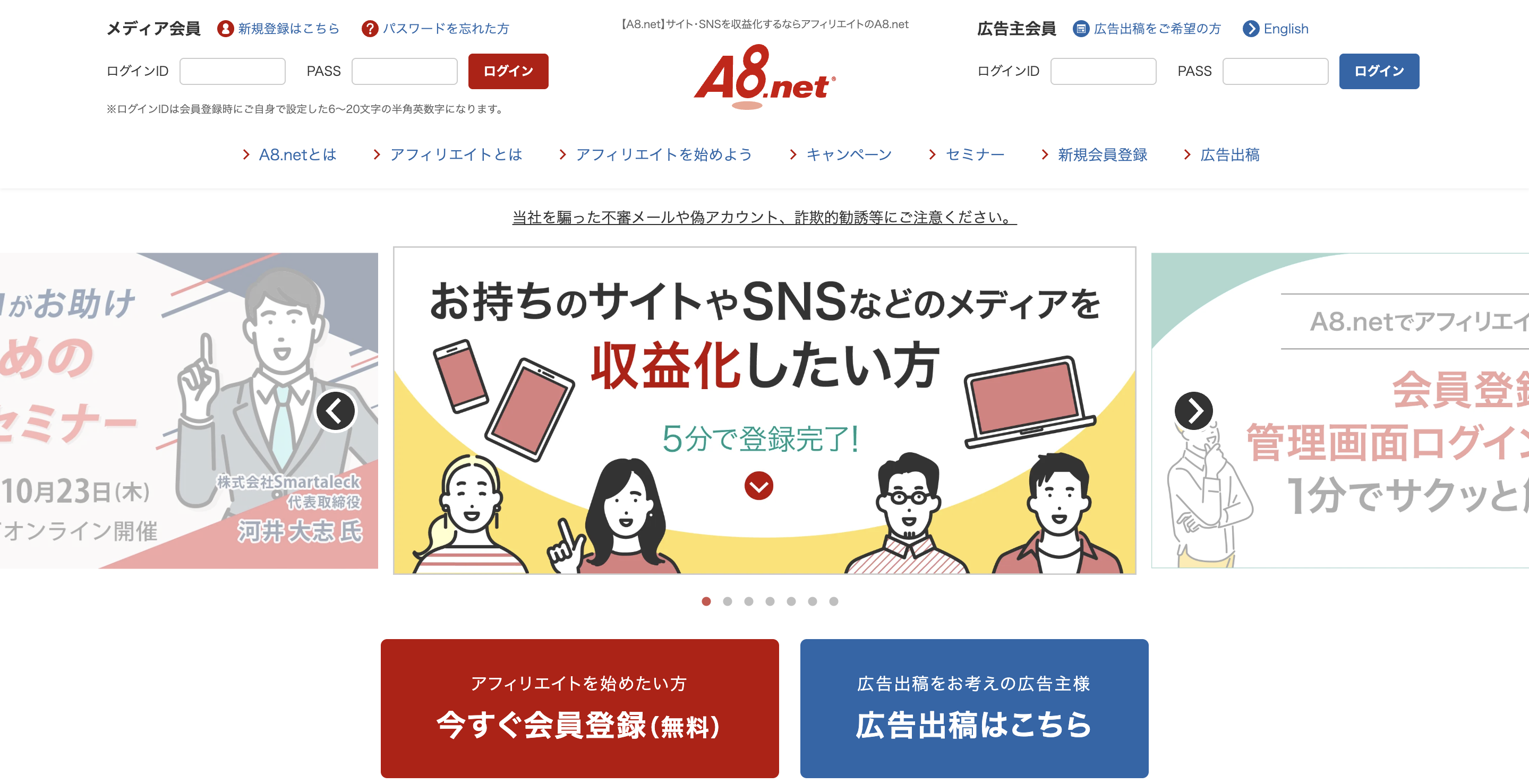 A8.netは、アフィリエイトを始めるなら必ず登録しておきたい、国内最大級のASPです。