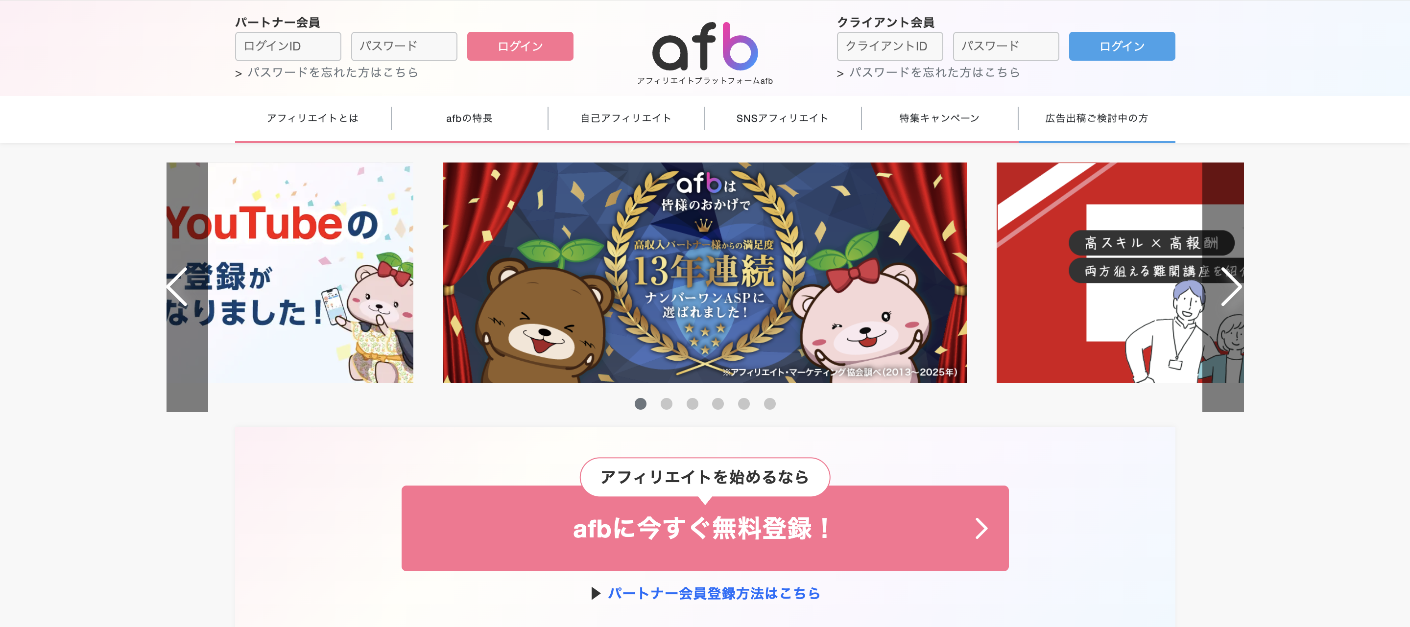 afb(アフィビー)は、特に美容や健康、転職といったジャンルの広告に強いASPです。報酬の支払いが早く、初心者でも安心して利用できます。